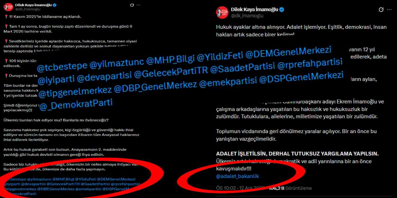“Bunlarla mı övüneceğiz” diyerek adalet çağrısı yapan Dilek İmamoğlu, önceki paylaşımlarının aksine, bu kez Adalet Bakanlığı’nın haricinde Beştepe ve MHP’li Feti Yıldız dahil olmak üzere 14 hesabı daha etiketledi.