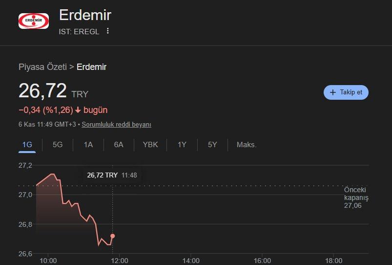 4 Kasım’da BIST100’da kapanışını 29,18 TL’den yapan Ereğli Demir ve Çelik Fabrikaları dün yüzde 7’yi aşan kayıp yaşamıştı.