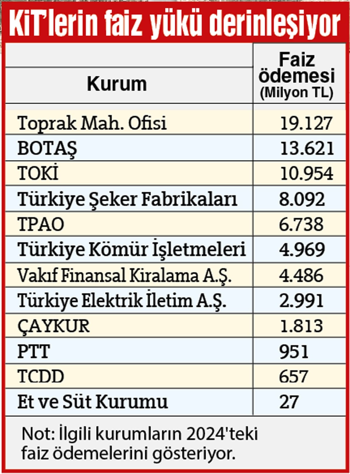 İkinci sırada 13 milyar 621 milyon lira faiz ödemesi ile BOTAŞ bulunurken, üçüncü sırada 10 milyar 954 milyon lira ile TOKİ yer aldı. Türkiye Şeker Fabrikaları 8 milyar 92 milyon TL faiz öderken, Türkiye Petrolleri de 6 milyar 738 milyon TL faiz ödedi. ÇAYKUR ise 1.8 milyar liradan fazla faiz ödemesi yaparken, PTT ise 2024’te yaklaşık 951 milyon liralık kaynağını faiz giderlerini karşılamak için kullandı. TBMM KİT Komisyonu üyesi Mehmet Tahtasız, “KİT’ler bankalardan aldığı krediler için her yıl milyonlarca lira faiz ödüyor. Faiz ödemeleri, KİT’lerin kazançlarının önemli bir kısmını tüketince zarara uğruyorlar” açıklamasında bulundu.