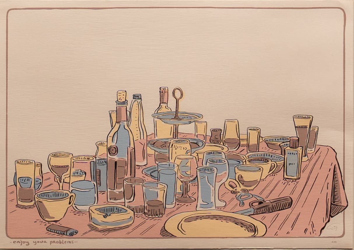 Enjoy your problems, 2021 yılında serigrafi baskı tekniği ile üretilen 50×70 cm boyutundaki eser, Borderless Editions tarafından hayata geçirildi. Vardal Caniş’in sofra temalı resimlerinden oluşan bir seçki, “Kim Kimi Yiyor?” başlıklı III. Sanat Dünyamız Film Günleri kapsamında Yapı Kredi Kültür Sanat Loca’da sanatseverlerle buluşuyor. Sergi, yemek kültürünü fiziksel eylemin ötesinde, hafıza, tanıklık ve ilişkilerle harmanlayarak izleyicilere unutulmaz bir deneyim sunmayı hedefliyor.